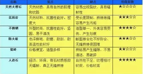 廚房臺面的材質(zhì)非常多,可綜合考慮適合自己的臺面。各種材質(zhì)臺面性能對比表如下: