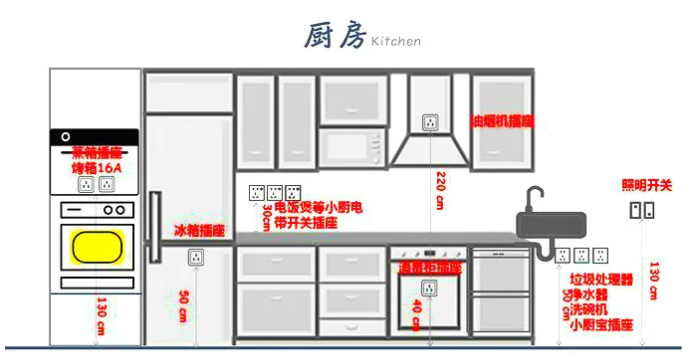 廚房電器種類繁多,要提前規(guī)劃好插座數(shù)量和位置。