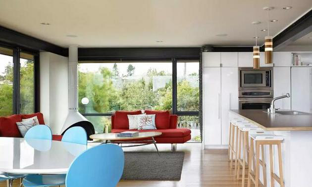 在這個開放式的平面圖中,天藍(lán)色的餐椅明顯地協(xié)調(diào)一致,但與家庭房間區(qū)域不同,劃定了這個空間。廚房操作臺上的吊燈和臺面上有自己的顏色。