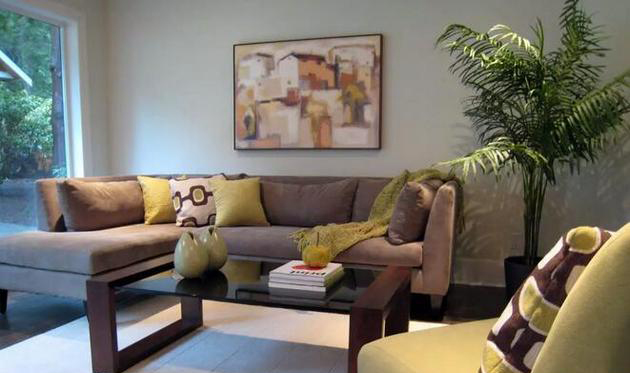這個配色創(chuàng)造了一個具有時尚感和現(xiàn)代感的客廳。柔和的褐色和灰褐色調(diào)(冷色調(diào))突出了黃綠色。讓黃綠色在此畫面中更加耀眼。