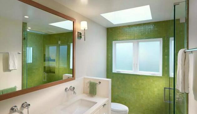 這個概念屬于我最喜歡的說法之一,“要么大膽或要么回家”。草綠色的瓷磚墻為這個浴室設(shè)置了舞臺。在其他地方添加一塊的綠色,也增強(qiáng)了色彩感。